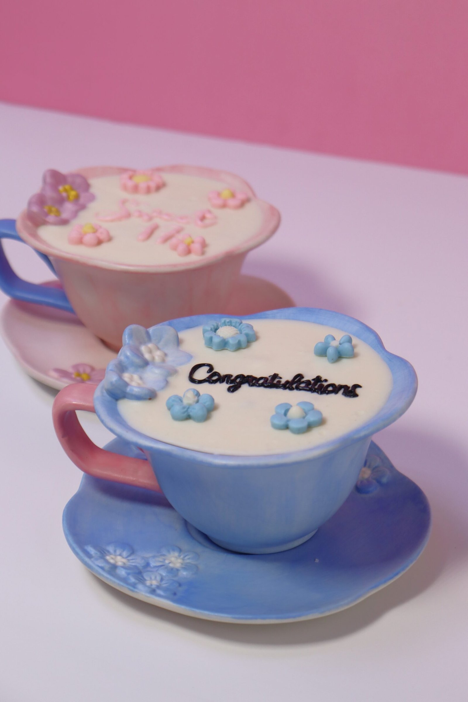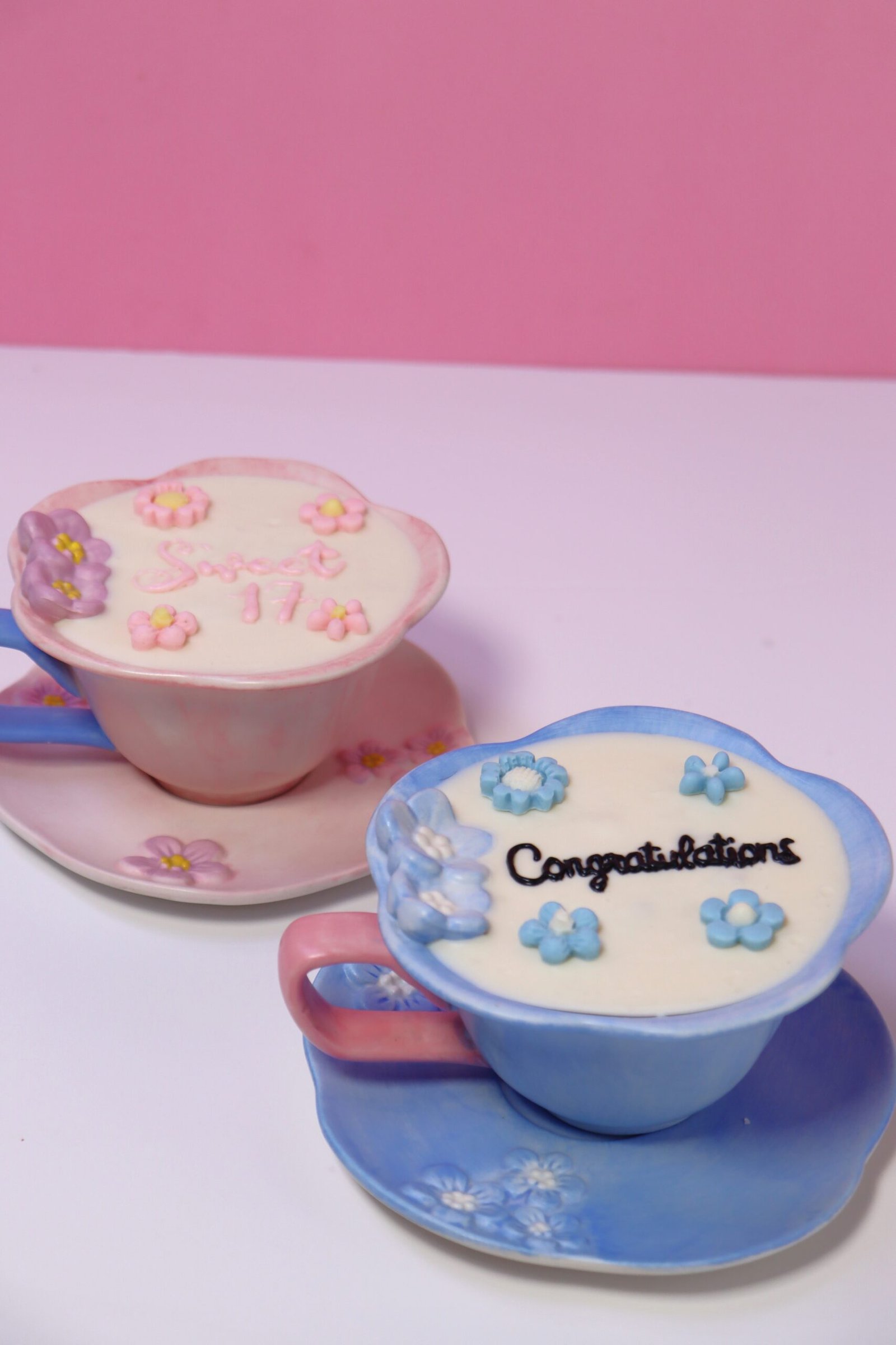 A charming dessert crafted in an elegant teacup design. Each cup is filled with rich layers of fudgy brownies and smooth Belgian chocolate, creating a decadent surprise beneath its delicate surface. Topped with a creamy layer and decorated with pastel flowers, every piece carries a personalized message — perfect for celebrating life’s sweetest moments.
