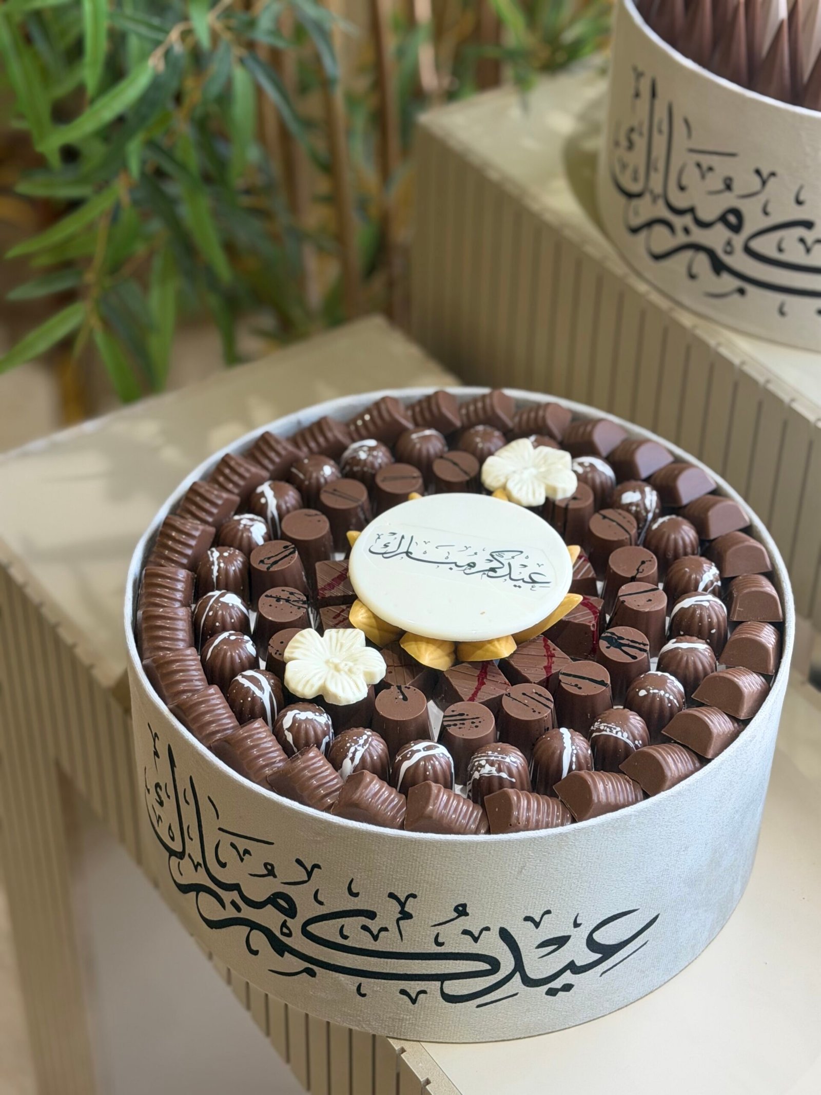 Luxury chocolate velvet box with 95 assorted chocolate pieces beautifully arranged in an elegant round box. Perfect for Eid gatherings and gifting.