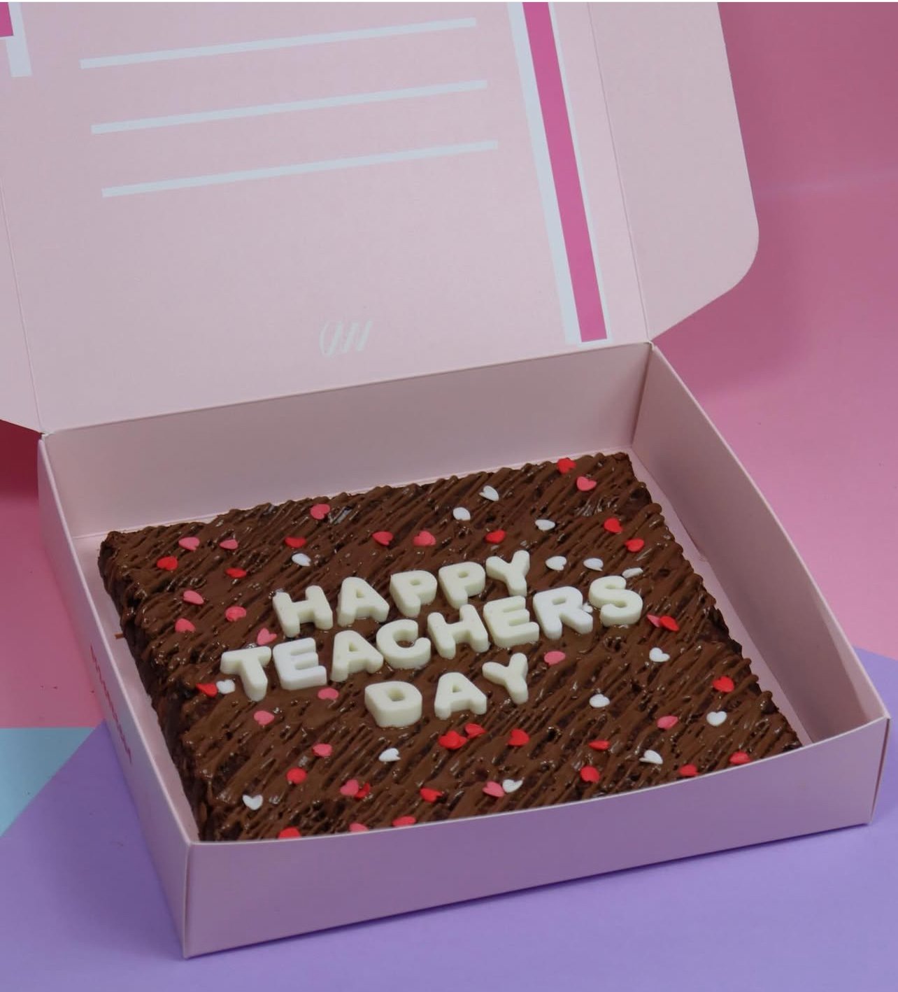 This rich, fudgy brownie slab is topped with smooth Belgian chocolate drizzle and decorated with colorful heart sprinkles. Finished with the message “HAPPY TEACHER’S DAY” in white chocolate letters, it’s the sweetest way to show gratitude and appreciation.The box has 25 pieces .