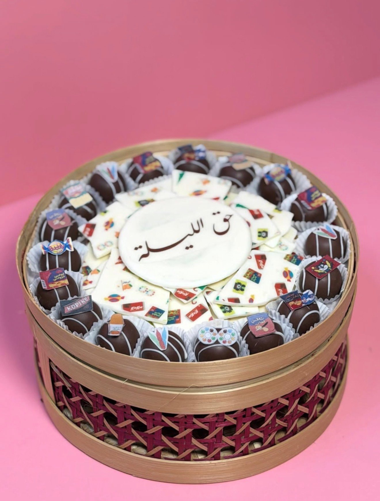 Hag Al Lilah themed box , 16 pcs of Oreo truffles topped with sugar printed paper , and 300 grams printed white chocolate. Topped with logo .