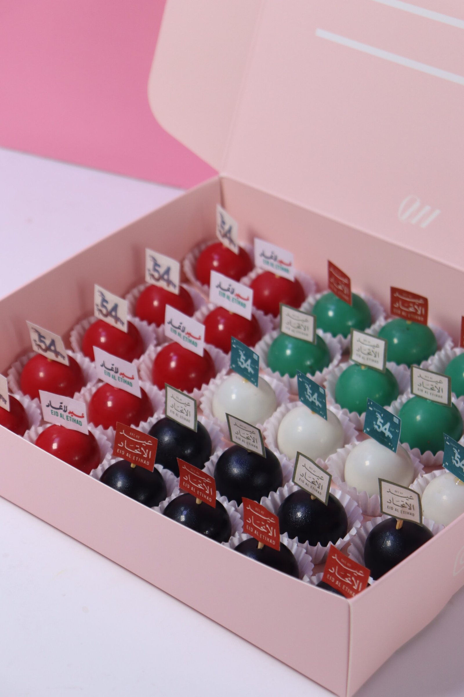 Celebrate UAE National Day with our exclusive chocolate 30pc truffle box, crafted in the colors of the flag and topped with festive uae logo toppers. A perfect gift and a sweet way to honor the spirit of the union.