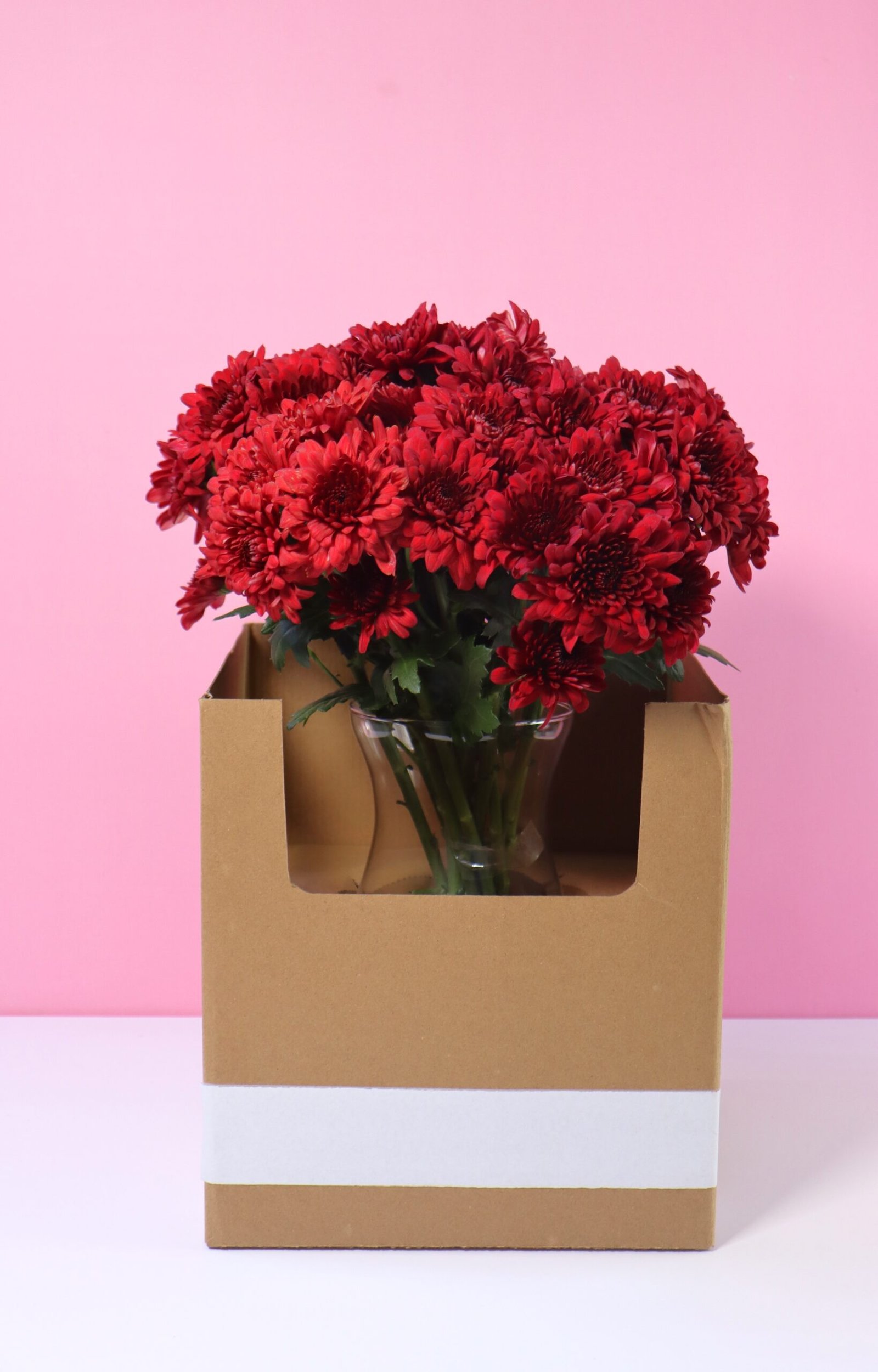 Rustic Brown Floral Gift Box with Red Chrysanthemums in a glass vase -Make every moment memorable with this stunning arrangement of red chrysanthemums presented in a sleek rustic brown box. Symbolizing love, passion, and admiration, these vibrant blooms are the perfect choice for heartfelt occasions and elegant décor.