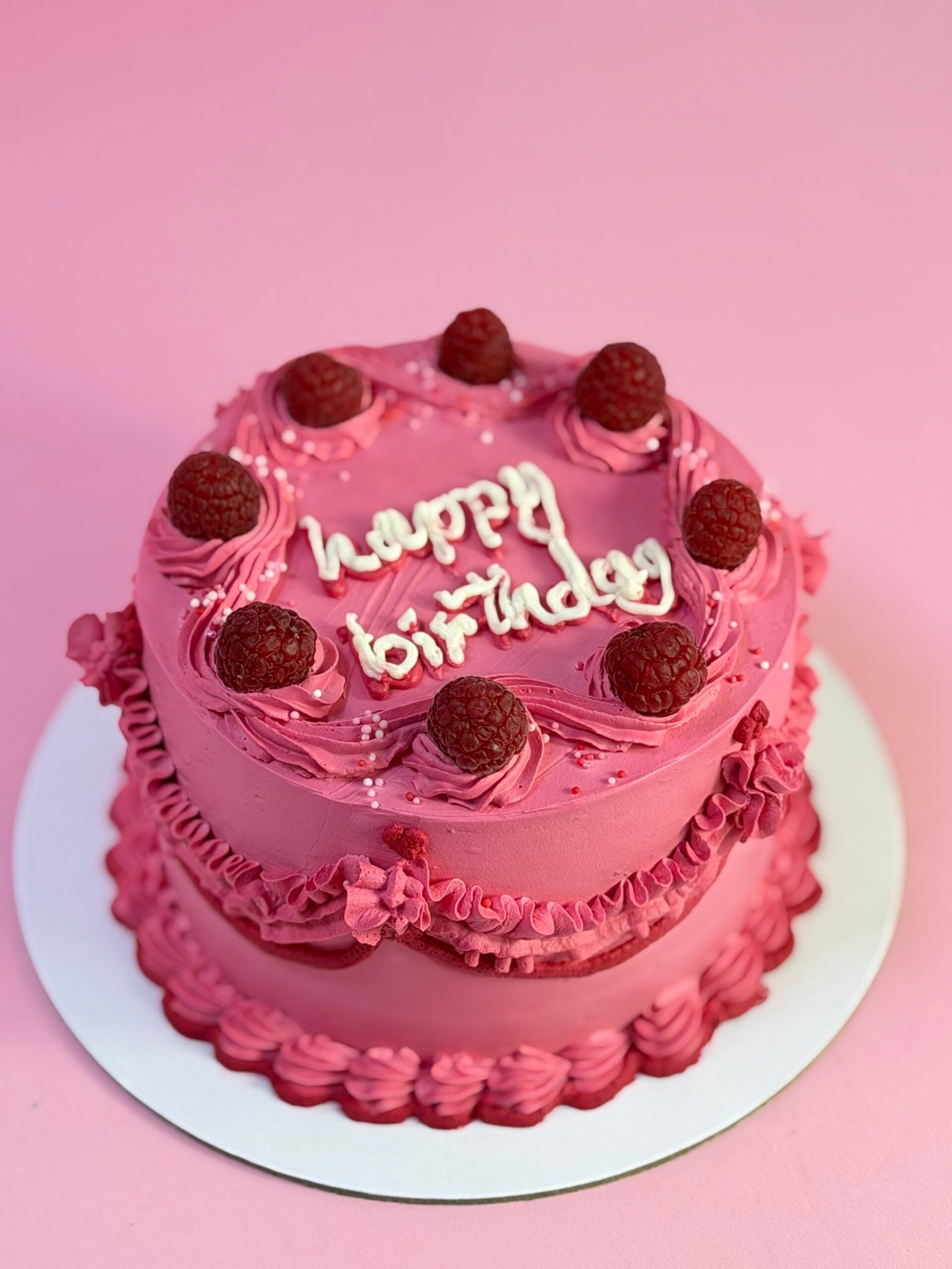 A dreamy blush-pink cake made with light, fluffy layers and luscious berry cream. Decorated with fresh raspberries and elegant swirls, it’s a delightful treat that brings sweetness and charm to any special occasion.