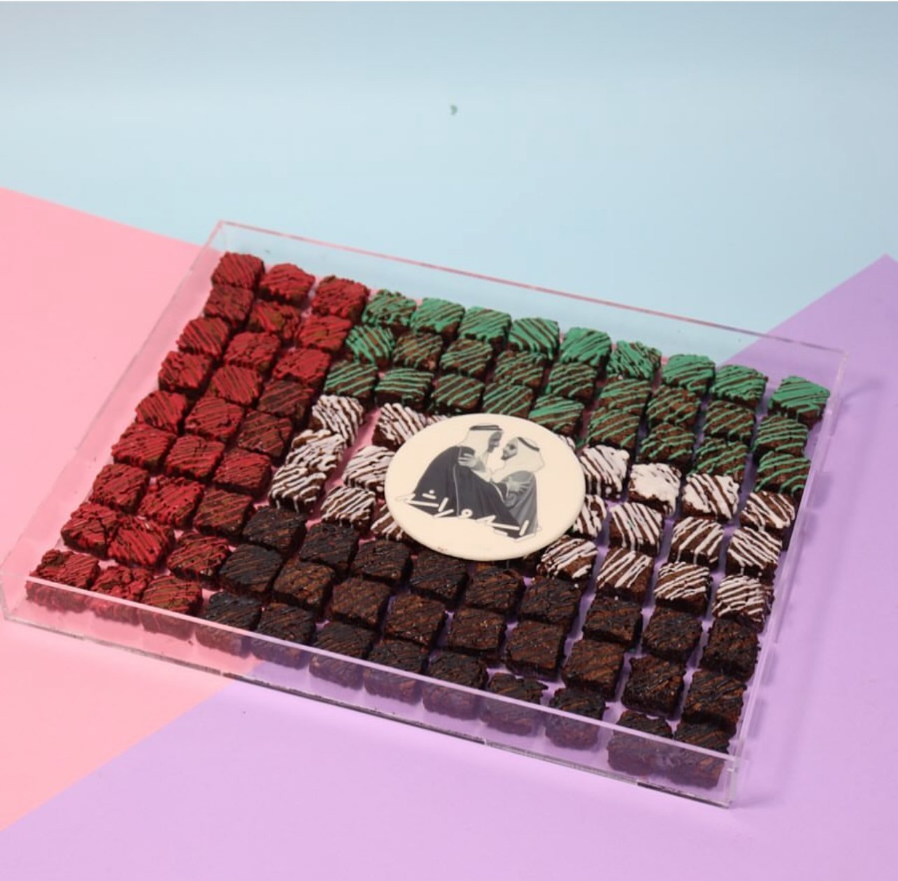 Fudgy chocolate brownie bites in a acrylic tray topped with UAE flag colors , and a logo on top . ( logo is customizable ) . Perfect for celebrations, gifting, and parties 🇦🇪🤎