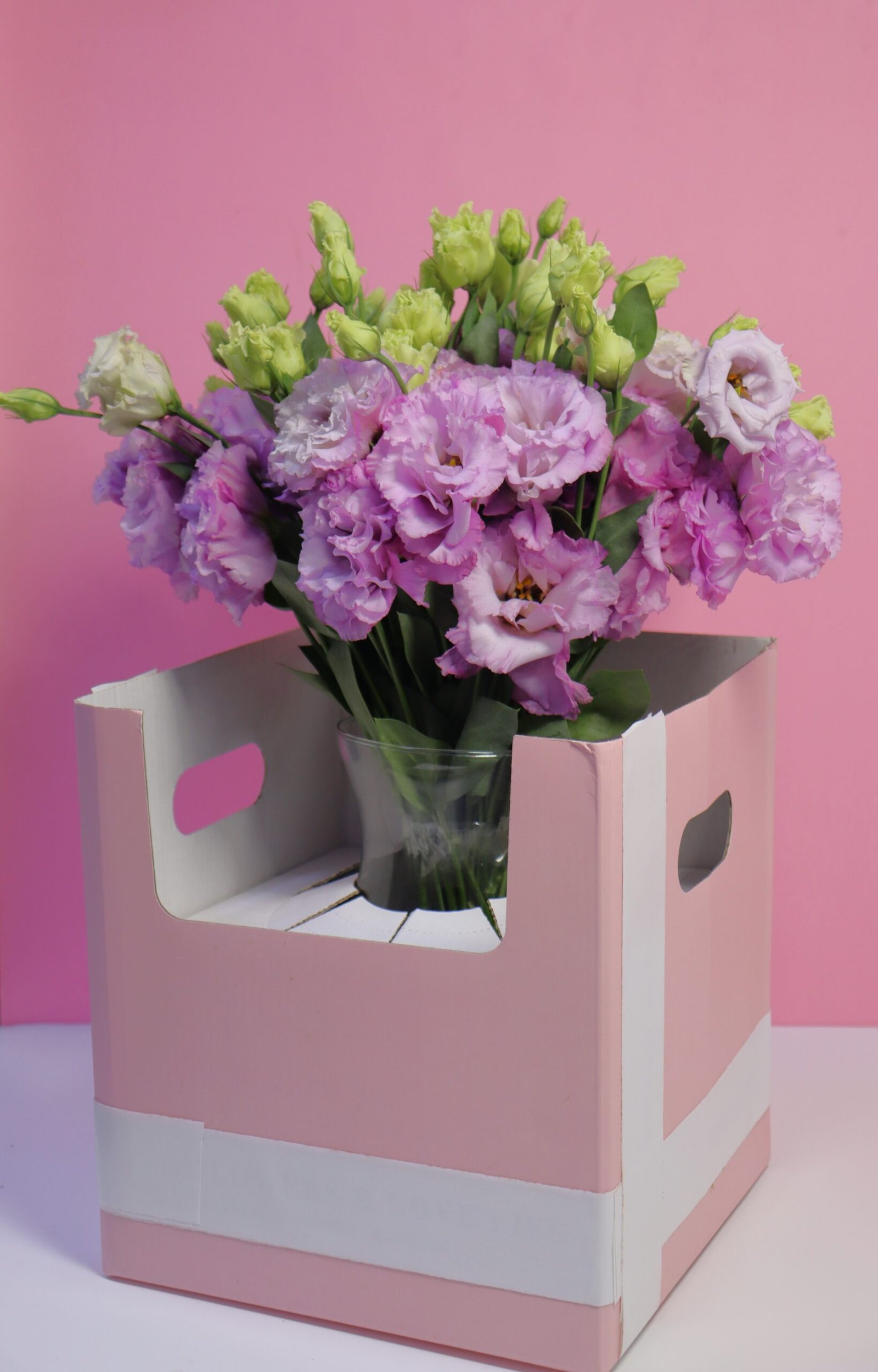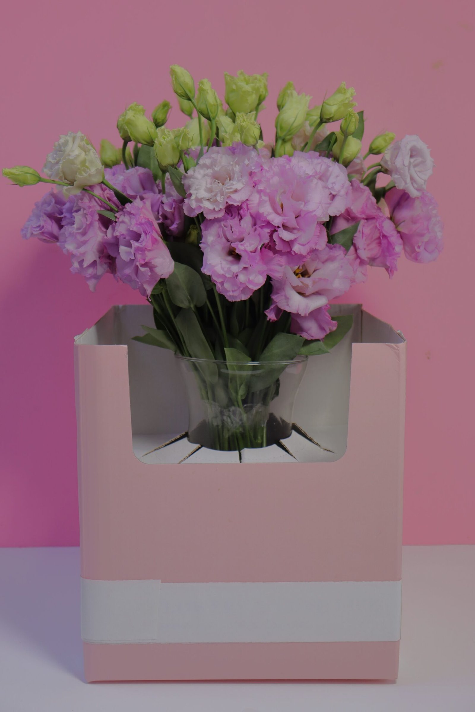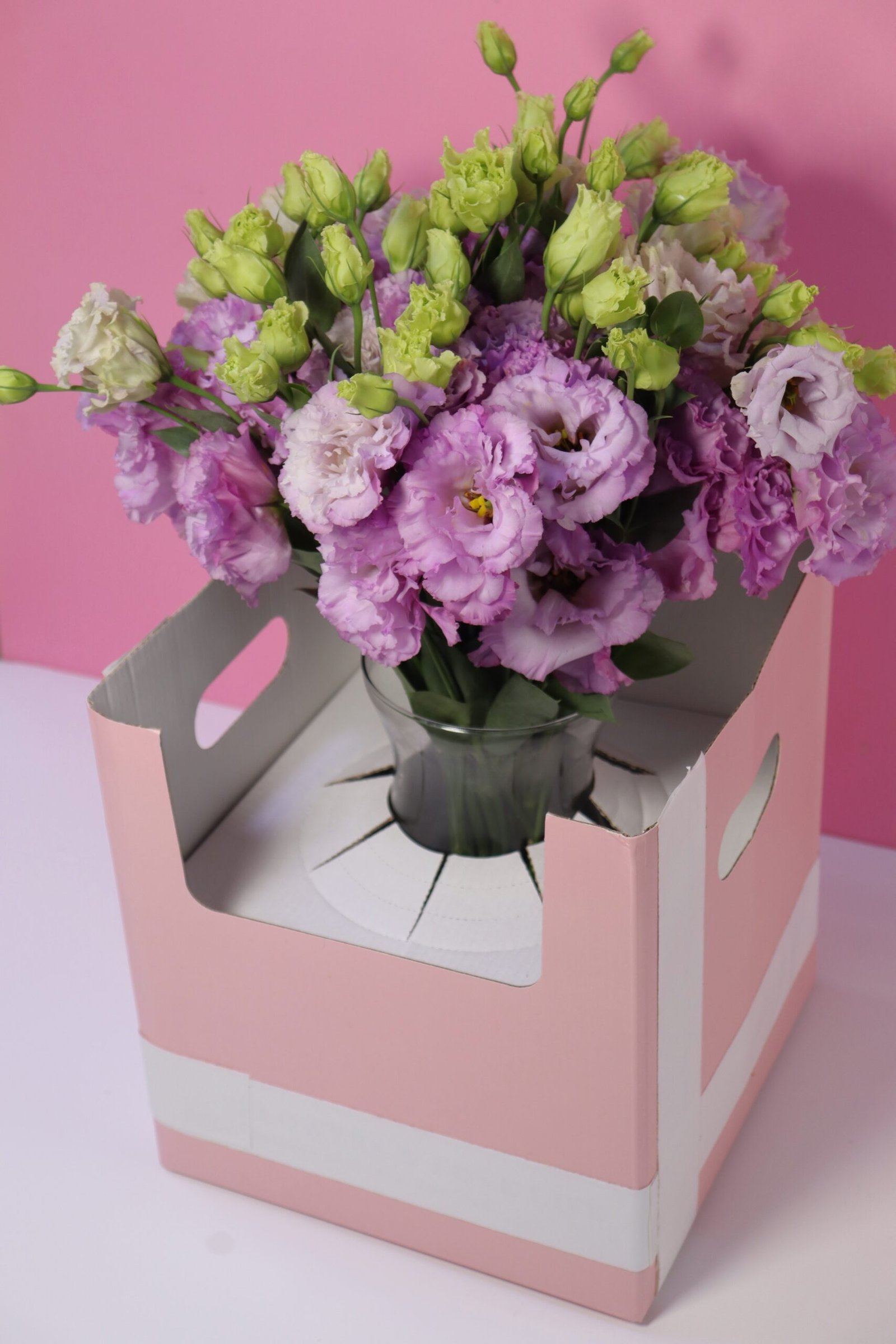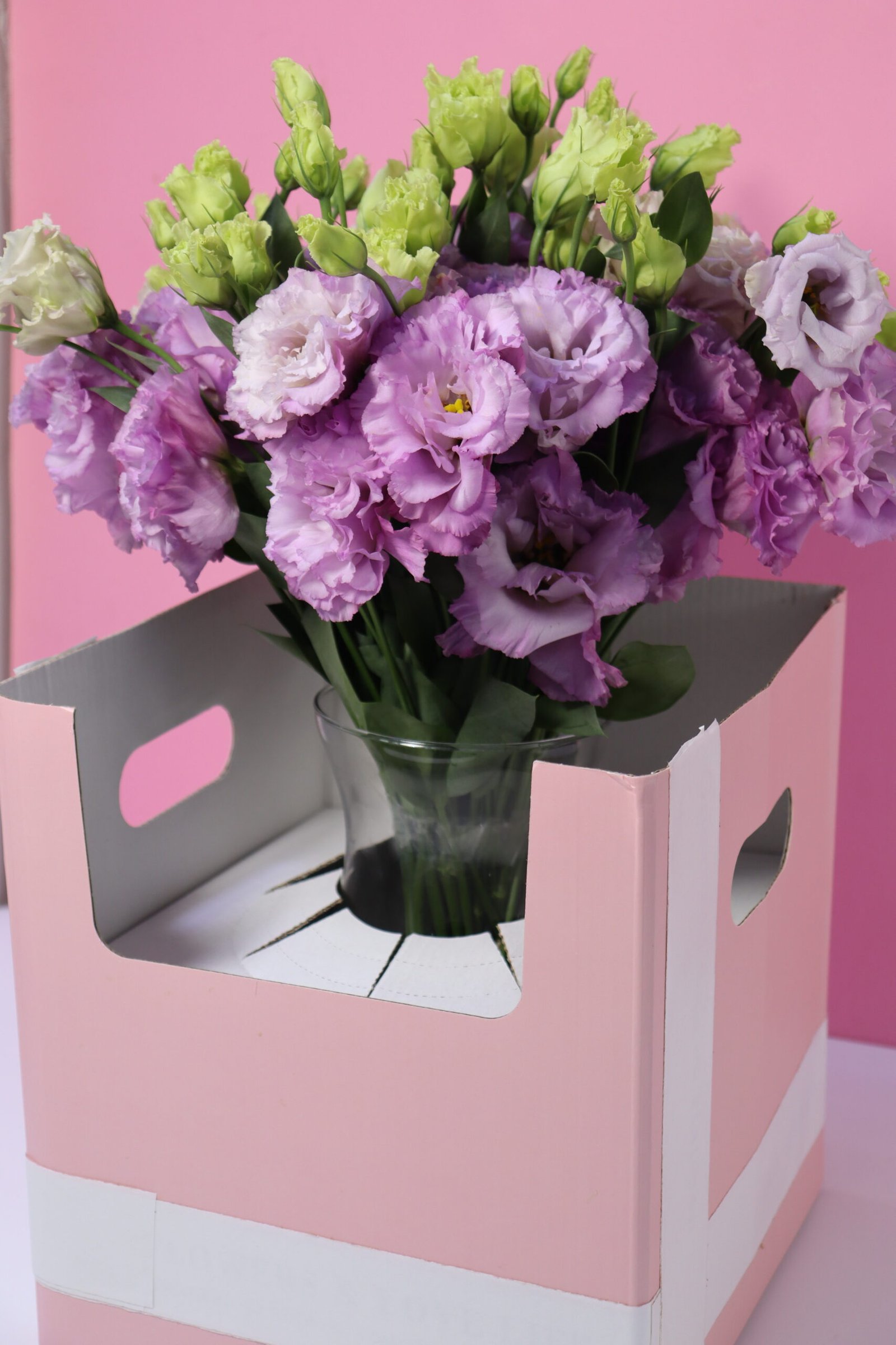 A lush, hand-crafted arrangement featuring a dome of light purple and white wave flowers, beautifully set in a clear vase and presented in a chic pastel pink gift box. The vibrant blend of purple tones with delicate white accents creates a striking and graceful bouquet, perfect for adding charm to any occasion.